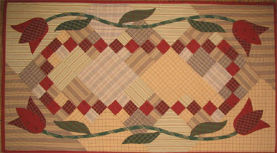 Learn how to assemble blocks on point and setting triangles. Needle-turn appliquéd vines, leaves and flowers are on the borders. Tulips, Cone Flowers and Poinsettias, Holly/Berries and Fall Leaves/Acorns are options for appliqué border options. Your background can be out of one material or for a scrappy look, different blending materials.